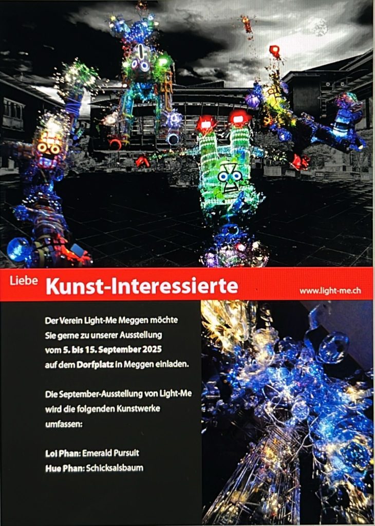 Der Vorstand des Vereins Light-Me möchte Euch am Freitag, 5. September 2025 um 19.30 Uhr, zur Vernissage unserer Ausstellung vom 5. bis 19. September 2025 auf dem Dorfplatz in Meggen einladen.